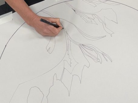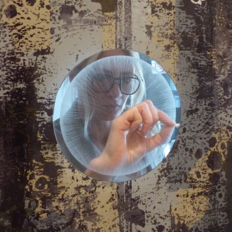 Amandine MANGENOT réalise ses créations sur place ou en atelier, toujours avec une attention fine au contexte architectural, l’adaptation aux éclairages, aux usages du lieu et à l’intention du commanditaire.